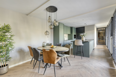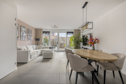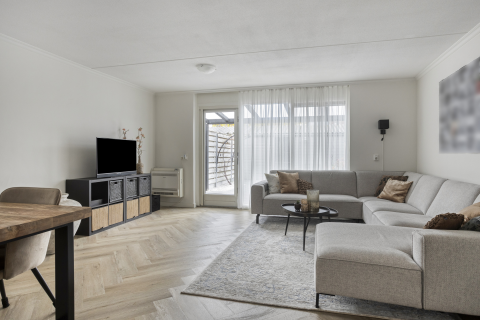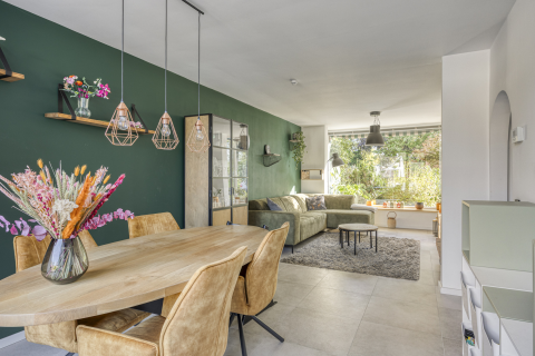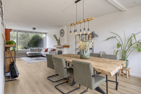 Eenmaal in de woonkamer valt meteen op hoeveel daglicht er binnenvalt. De doorzon-indeling met grote ramen aan beide kanten maakt deze ruimte extra aantrekkelijk. Aan de voorzijde is meer dan genoeg plek voor een comfortabele zithoek met een hoekbank en een tv-meubel. Aan de achterzijde richt je moeiteloos een eetgedeelte in met een ruime tafel en zes stoelen, met uitzicht op je tuin.