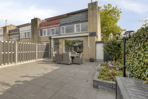 De achtertuin is met ca. 8 meter diep en ruim 6 meter breed een fijne buitenruimte, waar je met gemak een loungeset en eettafel kwijt kunt. Dankzij de combinatie van sierbestrating en een plantenborder is het onderhoud beperkt, maar toch met een groene uitstraling. Of je nu houdt van zonnen, barbecueën of gewoon in alle rust buiten zitten, hier kan het allemaal. Achterin de tuin staat een berging van zo’n 8 m² – groot genoeg voor je fietsen, gereedschap of tuinkussens. De wasmachine en droger zijn hier nu ook opgesteld, wat binnen weer ruimte scheelt. De overkapping aan de berging biedt extra beschutting én een fijne plek voor bijvoorbeeld de afvalbakken.
